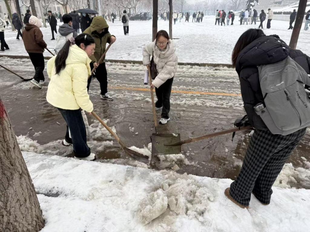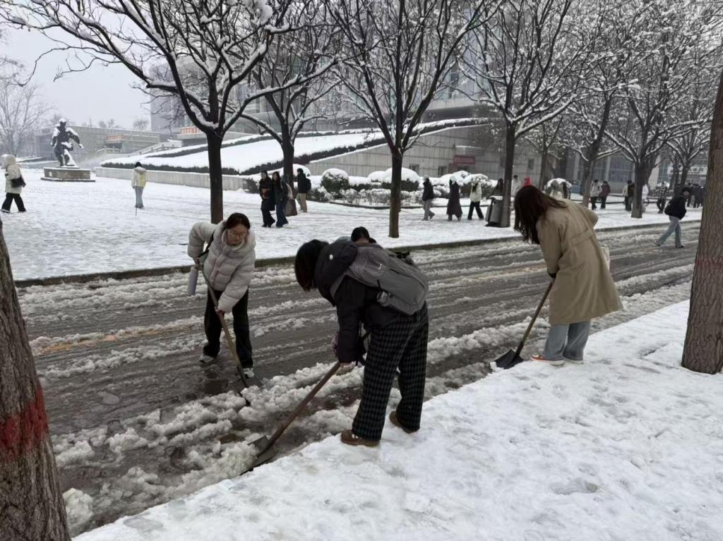 劳动教育实践区域的路段展开全面清理。大家不畏严寒、干劲十足,铲冰、扫雪、归堆等环节衔接有序,配合默契。凛冽寒风中,志愿者们忙碌的身影与皑皑白雪交相辉映,构成校园里一道温暖而充满力量的风景线。经过近两小时的共同奋战,主要路段积雪冰层被彻底清除,为师生开辟出一条安全通畅的"平安路"。