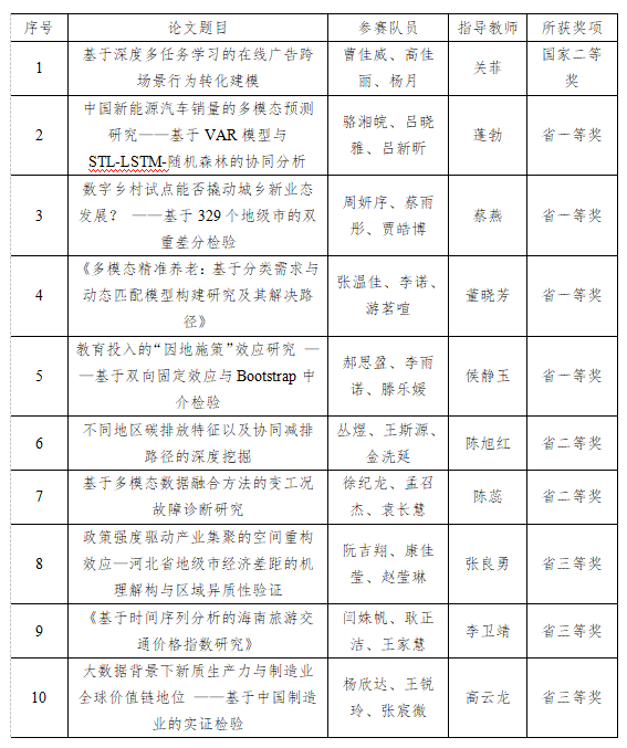 2025年(第十一届)全国大学生统计建模大赛自2月开赛以来,全国共有30941支队伍提交论文参赛,评出891支队伍入围国赛,经国赛通讯评审、现场会议评审和现场答辩赛角逐,最终评选出一等奖90支,二等奖178支,三等奖617支。我校学生共有30支队伍参赛,最终获得国家二等奖1项、省级一等奖4项、省级二等奖2项、省级三等奖7项。获奖名单如下: